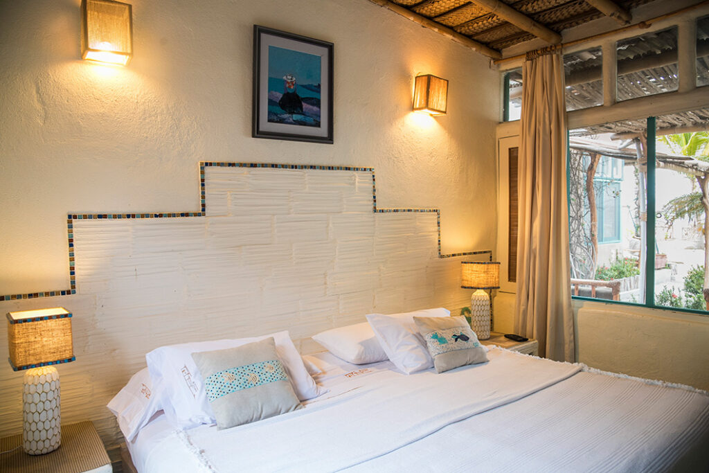 Amplias, luminosas y decoradas en tonos blancos con detalles rústicos, crean un ambiente acogedor ideal para quienes buscan habitaciones frente al mar , perfectas para desconectarse y relajarse en el norte del Perú.